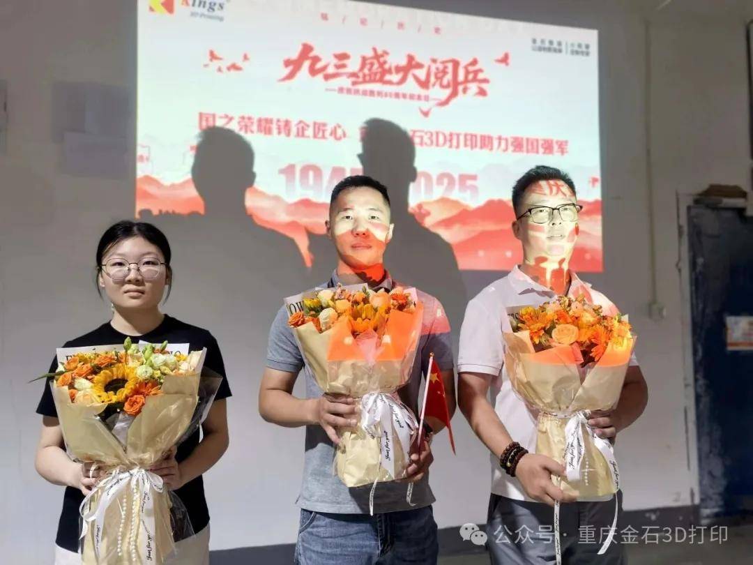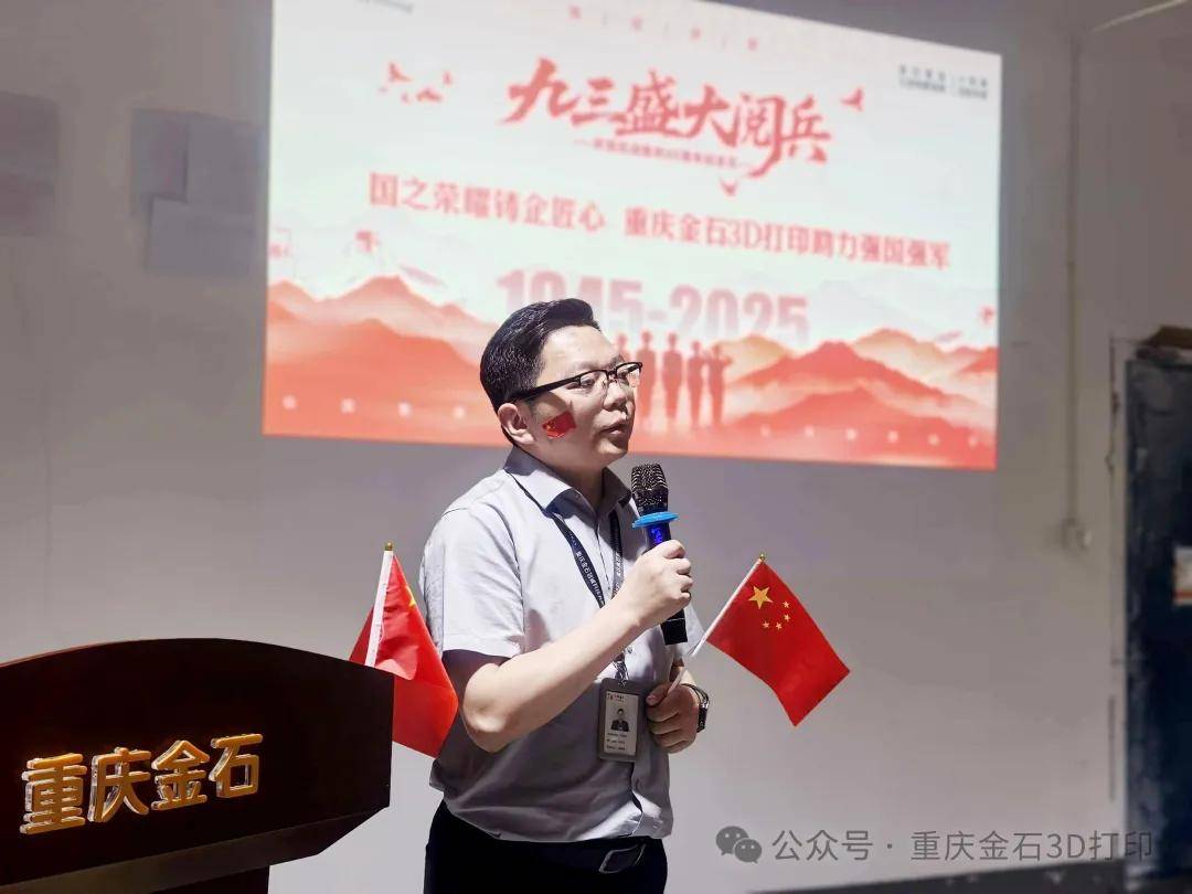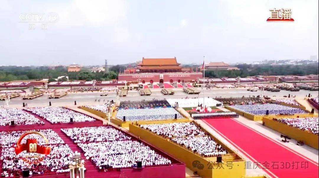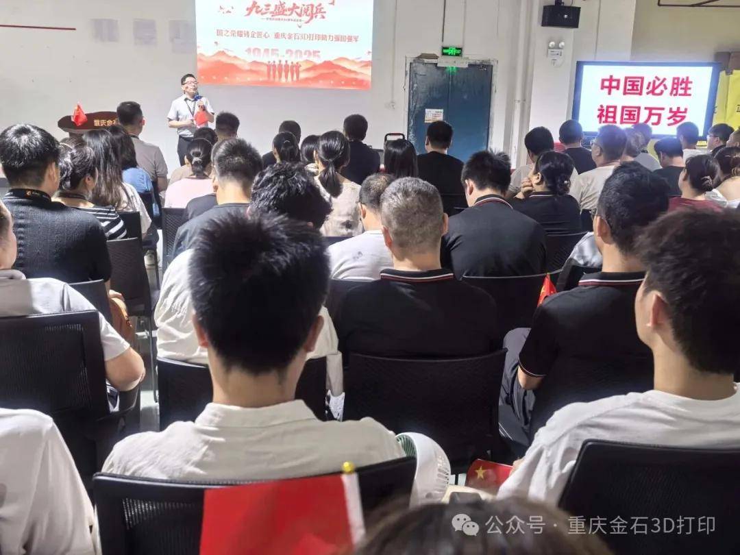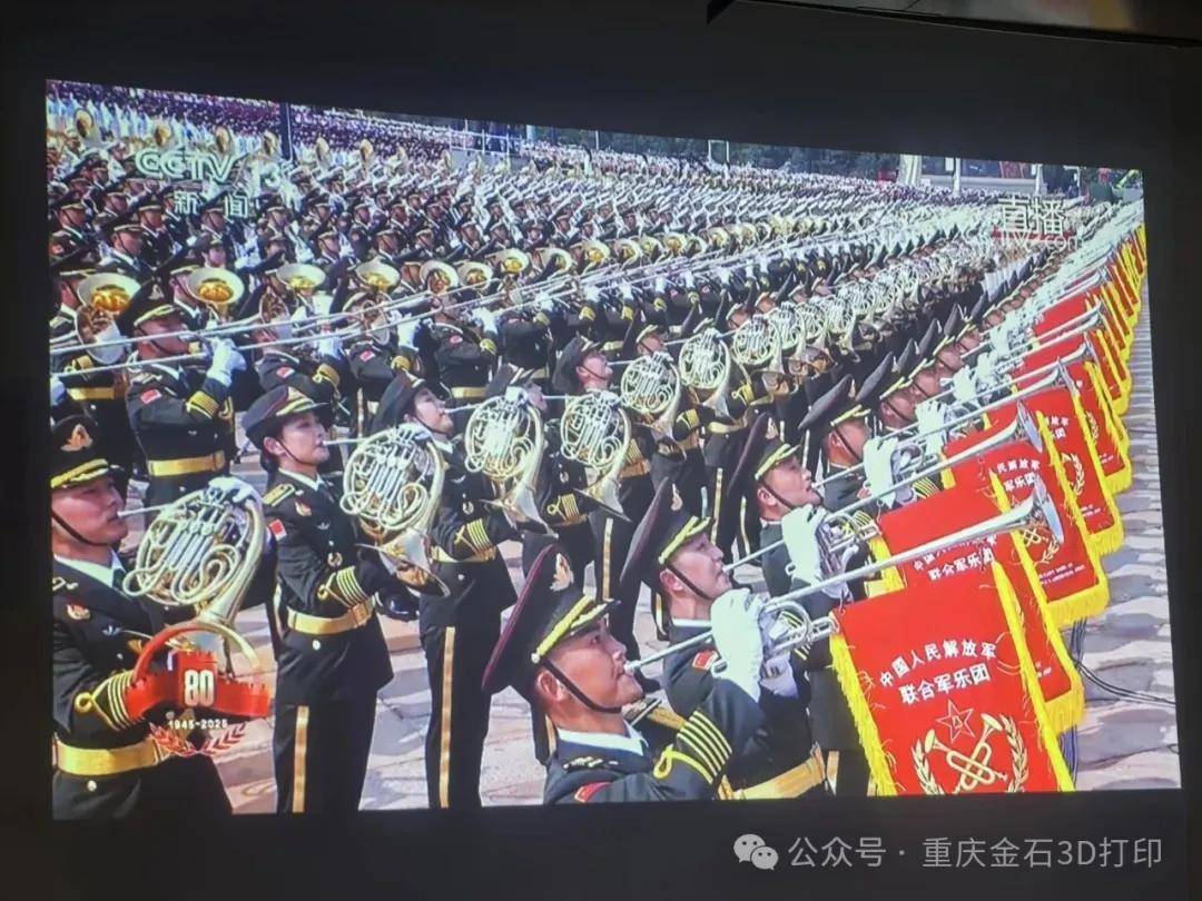 2025年9月3日上午9时,纪念中国人民抗日战争暨世界反法西斯战争胜利80周年阅兵式在北京天安门广场隆重举行。与此同时,在重庆金石3D打印公司的二楼活动室里,全体员工齐聚一堂,手拿着摇旗,脸贴着心形国旗,共同注视着屏幕上的实时画面。当一架架先进战机、一辆辆威武战车驶过天安门广场时,重庆金石的员工们心中充满了自豪,因为他们深知,这些装备中不少都凝聚着3D打印技术的贡献。