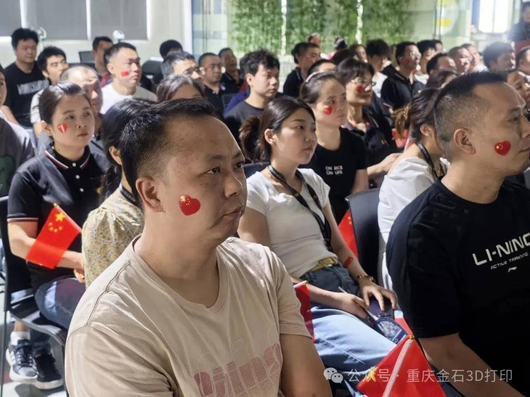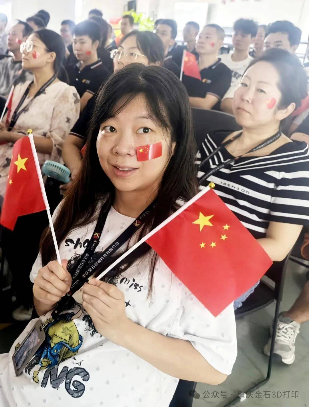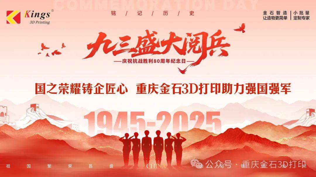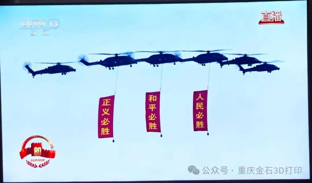 2025年9月3日上午9时,纪念中国人民抗日战争暨世界反法西斯战争胜利80周年阅兵式在北京天安门广场隆重举行。与此同时,在重庆金石3D打印公司的二楼活动室里,全体员工齐聚一堂,手拿着摇旗,脸贴着心形国旗,共同注视着屏幕上的实时画面。当一架架先进战机、一辆辆威武战车驶过天安门广场时,重庆金石的员工们心中充满了自豪,因为他们深知,这些装备中不少都凝聚着3D打印技术的贡献。