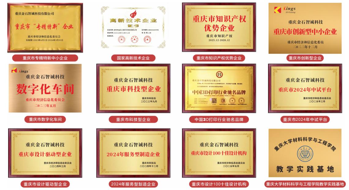 作为一家集工业设计、AI、3D打印快速智造于一体的高新技术企业,重庆金石自2020年成立以来,已先后获得“重庆市十佳设计机构”“国家高新技术企业”“重庆市专精特新企业”“重庆市设计驱动型企业”“重庆市知识产权优势企业”“重庆市2024年中试平台”“重庆市数字化车间”等数十项权威资质与荣誉认证。