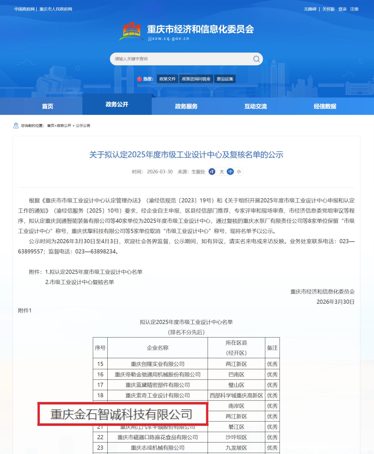 近日,重庆市经济和信息化委员会正式发布《关于拟认定2025年度市级工业设计中心及复核名单的公示》,重庆金石智诚科技有限公司(简称“重庆金石”)凭借卓越的设计创新能力与AI智造融合实力,成功入选“2025年度市级工业设计中心”名单,并获评“优秀”等级。这一荣誉不仅是对企业设计研发能力的高度认可,更标志着重庆金石在推动“设计+AI”驱动制造业高质量发展中迈出了坚实一步。